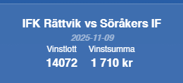 Vinnande lottnummer i söndagens 50/50-lotteri är 14072, stort grattis till dig som vinner 1710 kr! Vinnaren meddelas via sms.