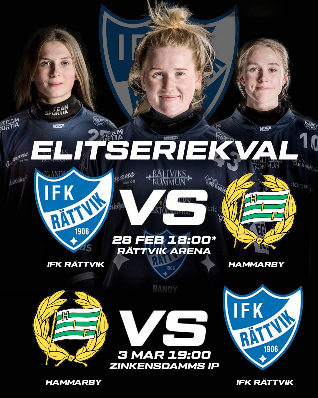 Nyheter Dam Nyheter Föreningen 2023-02-14 Damerna i kval till Elitserien Vårt budskap denna Alla Hjärtans Dag ❤️, är att Tisdagsvällen den 28 februari ska vi alla försöka att vara på plats i Arenan då vi kvalar mot Hammarby IF om platsen i Elitserien nästa säsong! Kvalet…
