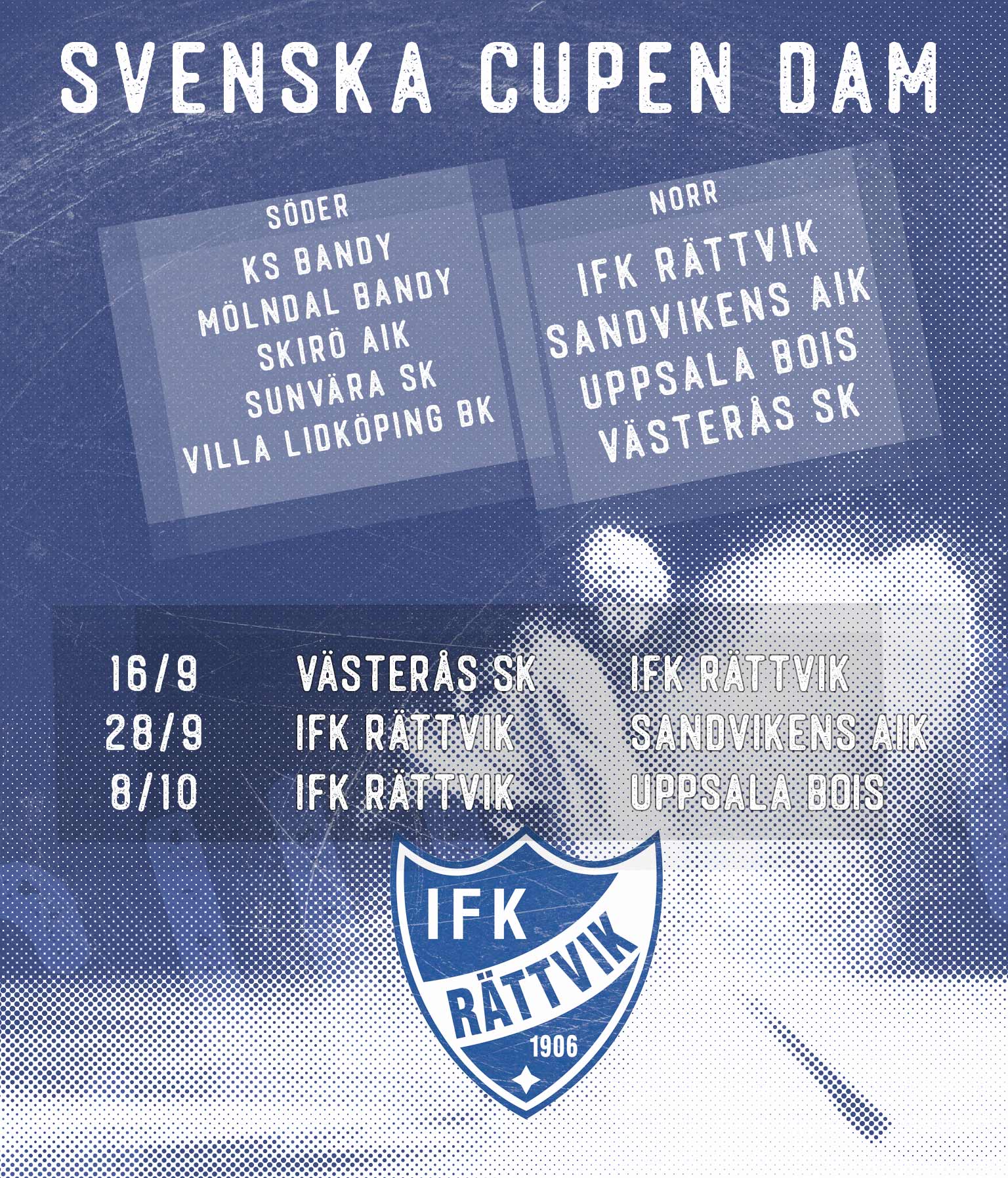 Nu är gruppindelningen och spelschemat klart för årets Svenska Cupen, damer. Vi möter Västerås, Sandviken samt Uppsala där matcherna den 28/9 och 8/10 kommer att spelas hemma i Arenan. Eventuellt finalspel är sedan inbokat till 14/15 oktober i Lidköping.