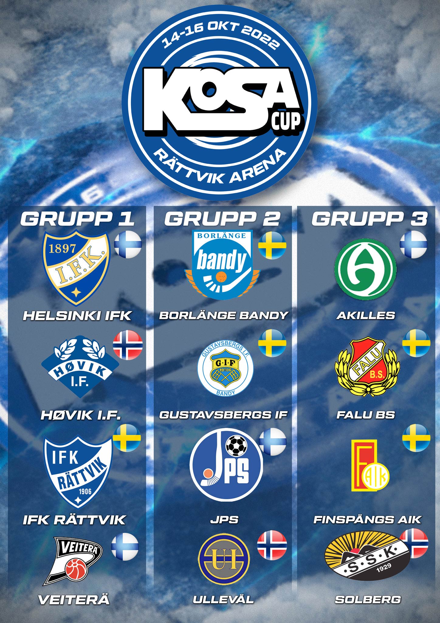 Den 14-16 oktober är det dags för den 13:e upplagan av Rättviks cup – i år sponsrad av KOSA! Som vanligt kommer det att vara bandy av högsta klass från morgon till kväll! Fyra lag från Finland, tre från Norge och fem svenska lag kommer att drabba samman! Totalt kommer det att spelas 24 intensiva matcher i Rättviks arena med start den 14 oktober kl 08.00 då IFK Rättvik möter det finska topplaget Veiterä.