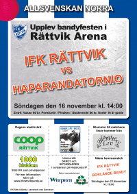 Nästa hemmamatch nu på söndag mot HaparandaTornio Nästa hemmamatch är nu på söndag den 16 november mot Haparandatornio kl. 14:00. Matchvärd: Coop Rättvik Vi ses i Rättvik Arena på söndag!